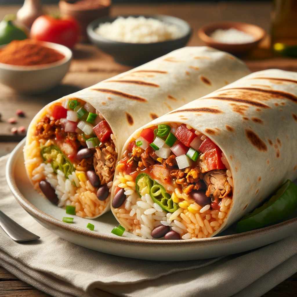 Beschreibung: Ein Burrito ist eine große Weizentortilla, die um eine Füllung aus Fleisch, Bohnen, Reis, Käse und anderen Zutaten gewickelt wird. Burritos werden oft in Alufolie eingewickelt serviert.