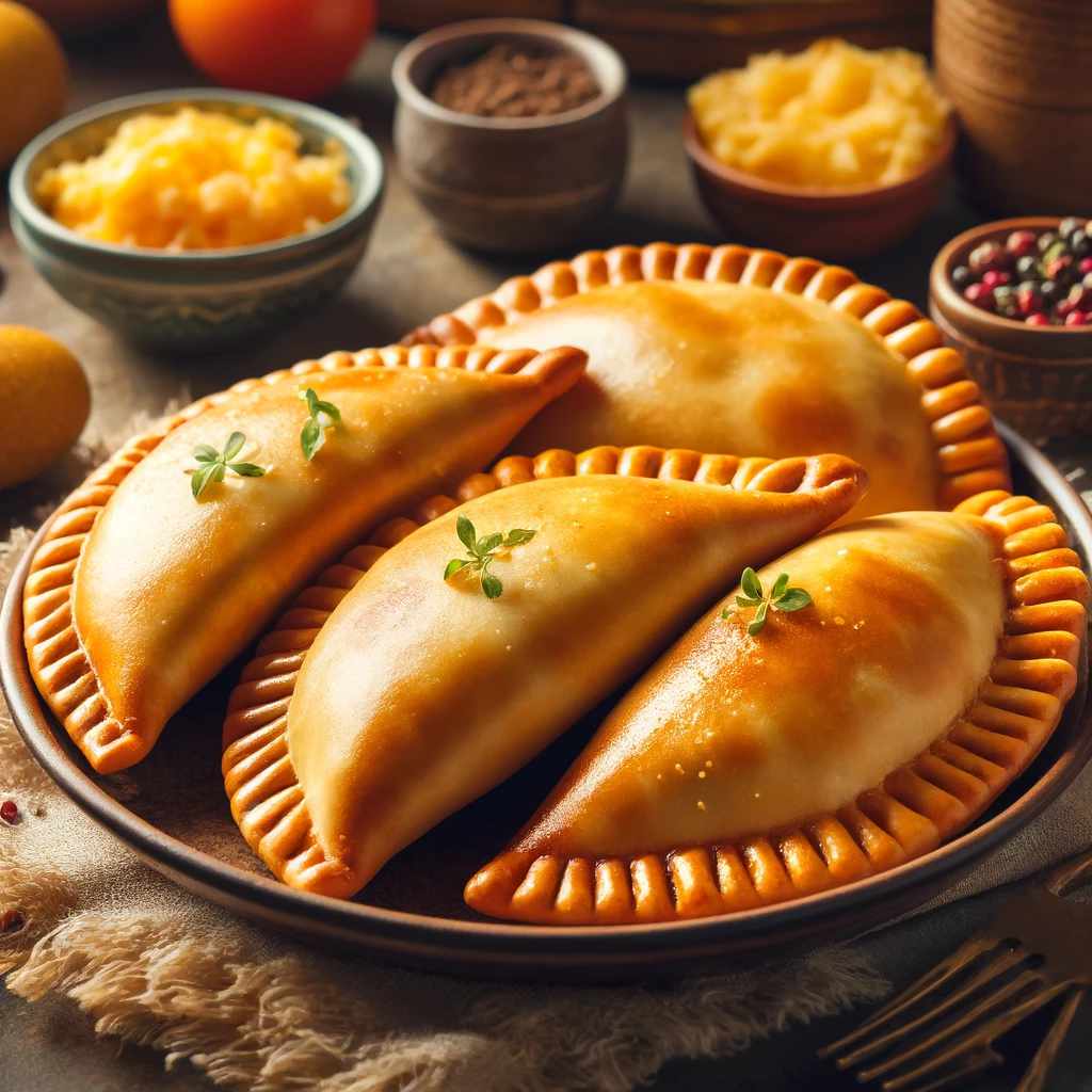 Beschreibung: Empanadas sind halbmondförmige Teigtaschen, die mit einer Vielzahl von Füllungen wie Fleisch, Käse, Gemüse oder Obst gefüllt und anschließend gebacken oder frittiert werden.