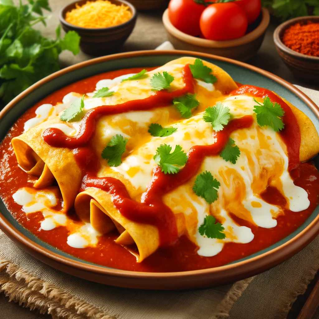 Beschreibung: Enchiladas sind mit Fleisch, Käse oder Bohnen gefüllte Tortillas, die in eine würzige Sauce eingewickelt und mit Käse überbacken werden. Sie werden meist im Ofen gebacken.