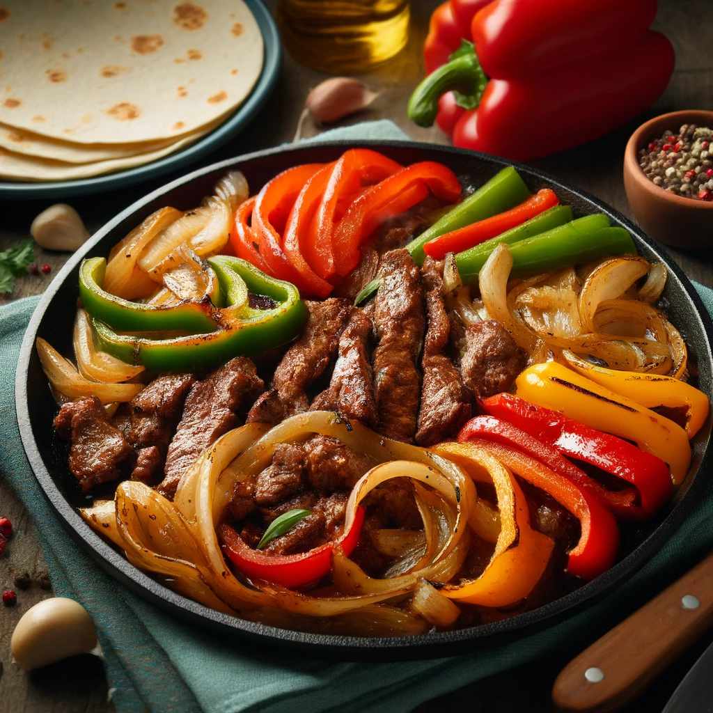 Beschreibung: Fajitas bestehen aus gegrilltem Fleisch, das zusammen mit Paprika und Zwiebeln serviert wird. Die Zutaten werden oft in einer heißen Pfanne serviert und mit Tortillas, Salsa und Guacamole kombiniert.