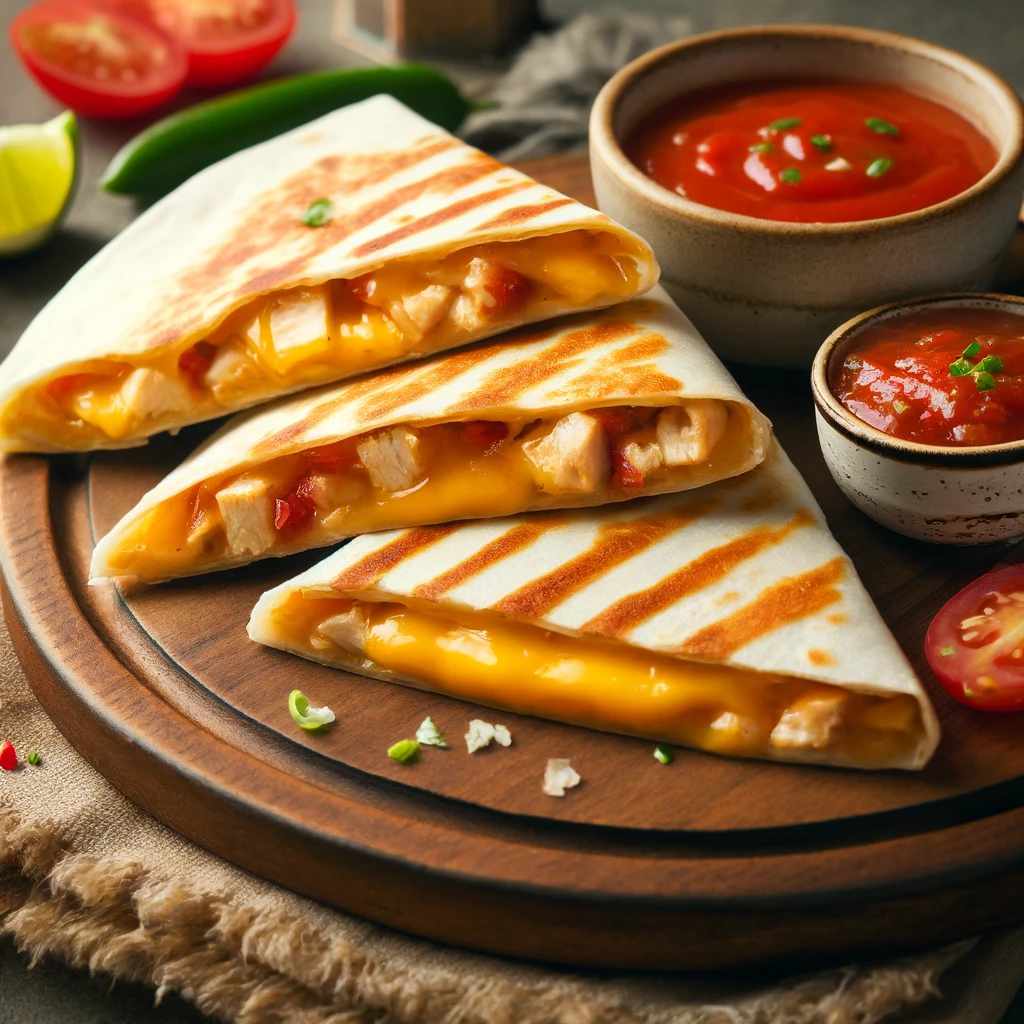 Beschreibung: Quesadillas bestehen aus zwei Tortillas oder einer gefalteten Tortilla, die mit Käse und oft weiteren Zutaten wie Fleisch oder Gemüse gefüllt und dann gegrillt werden, bis der Käse schmilzt.