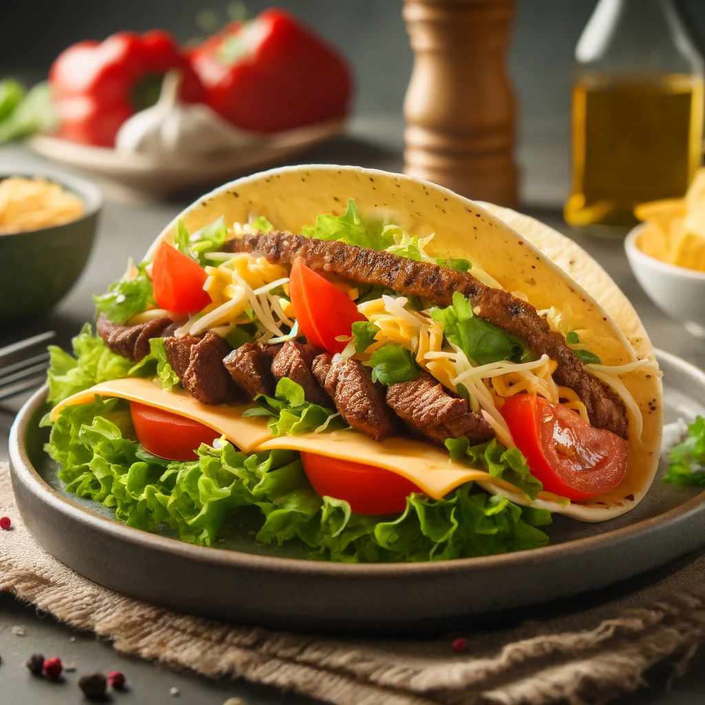 Beschreibung: Ein Taco besteht aus einer weichen oder harten Tortilla, die mit verschiedenen Zutaten wie Fleisch, Käse, Bohnen, Salat und Salsa gefüllt ist. Tacos werden oft mit Limette und Koriander garniert.